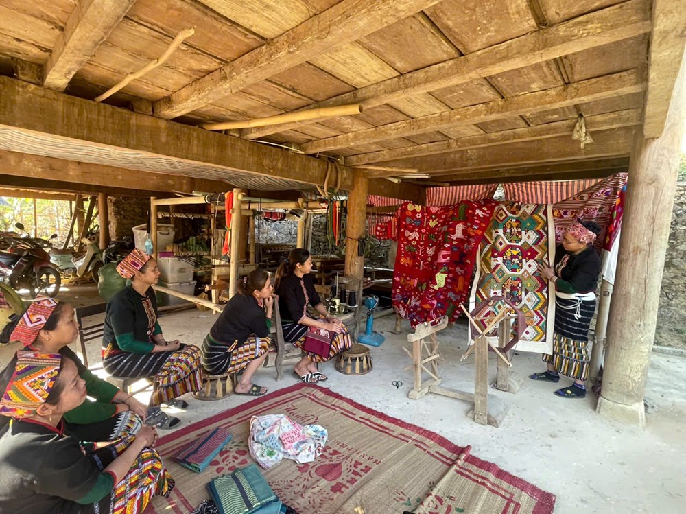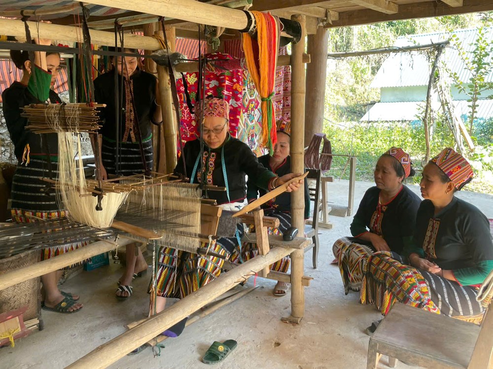 Buổi học truyền dạy, trao đổi kinh nghiệm nghề dệt thổ cẩm phụ nữ vùng cao. Ảnh: Phan Thơm