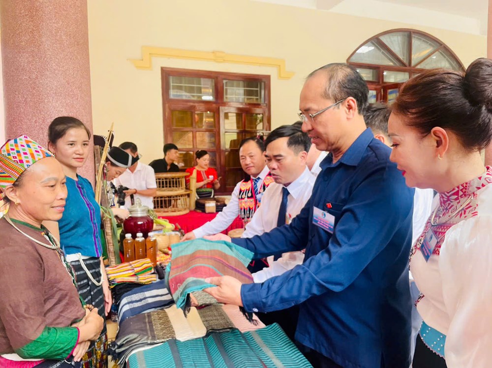 Lãnh đạo UBND huyện Kỳ Sơn trao đổi, xem sản phẩm hội viên dệt thổ cẩm bản Na, huyện Kỳ Sơn, Nghệ An